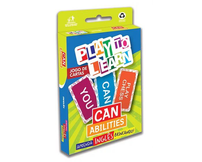 O deck de carts CAN-ABILITIES possibilita aprender a construir frases afirmativas, interogativas e negativas em inglês. Cada carta tem um código de cores que auxilia o aprendiz a organizar as cartas de acordo com as partes do discurso; can (azul), sujeito (rosa) e verbo (laranja).